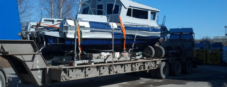 Не смотря на то, что "Наутилус 800" имеет ширину, позволяющую без ограничений перевозить его по дорогам общего пользования, транспортировка такого катера на дальние расстояния является сложной логистической задачей. В данном случае "Наутилус" был установлен на прицепе, который будет в дальнейшем использован для его перевозки. Оси и колеса прицепа были демонтированы, а его рама (вместе с катером) закреплена на платформе специального низкорамного трала для перевозки крупногабаритной техники. Такое решение позволило не выйти за допустимые транспортировочные габариты ни по одному измерению.